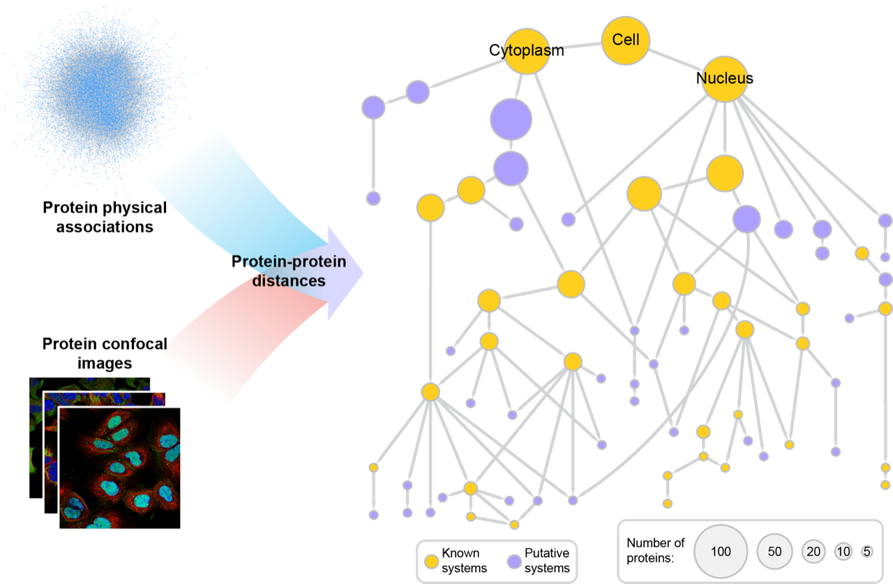 MuSIC integrates data from numerous datasets, some of which are generated in this project and others in sister projects (e.g., Human Protein Atlas, BioPlex Interactome). Deep neural networks are used to embed each protein in each data modality. For example, node2vec is used to create an embedding for each protein from networks based upon interaction neighborhoods, and Densenet is used to create an embedding for each protein from the imaging data based upon subcellular distributions. Embeddings from the two separate modalities are integrated using either supervised or unsupervised machine learning. Similarities between the integrated embeddings are calibrated to physical distances by calibrating with known subsystems in the Gene Ontology. Pan-resolution community detection is performed to construct a hierarchy of subcellular systems at different scales, from large organelles to small protein complexes. The toolkit to construct MuSIC maps is freely available on GitHub with usage documentation here.